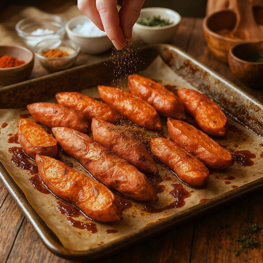 A legfontosabb szabály: ne zsúfoljuk túl a sütőlemezt! Az édesburgonya daraboknak elegendő helyre van szükségük, hogy a forró levegő szabadon áramolhasson körülöttük. Ha túl sok darabot zsúfolunk egy tepsire, azok párolódni fognak a sütés helyett, és puha, szivacsos lesz a végeredmény. Inkább süssünk több adagban, ha szükséges.